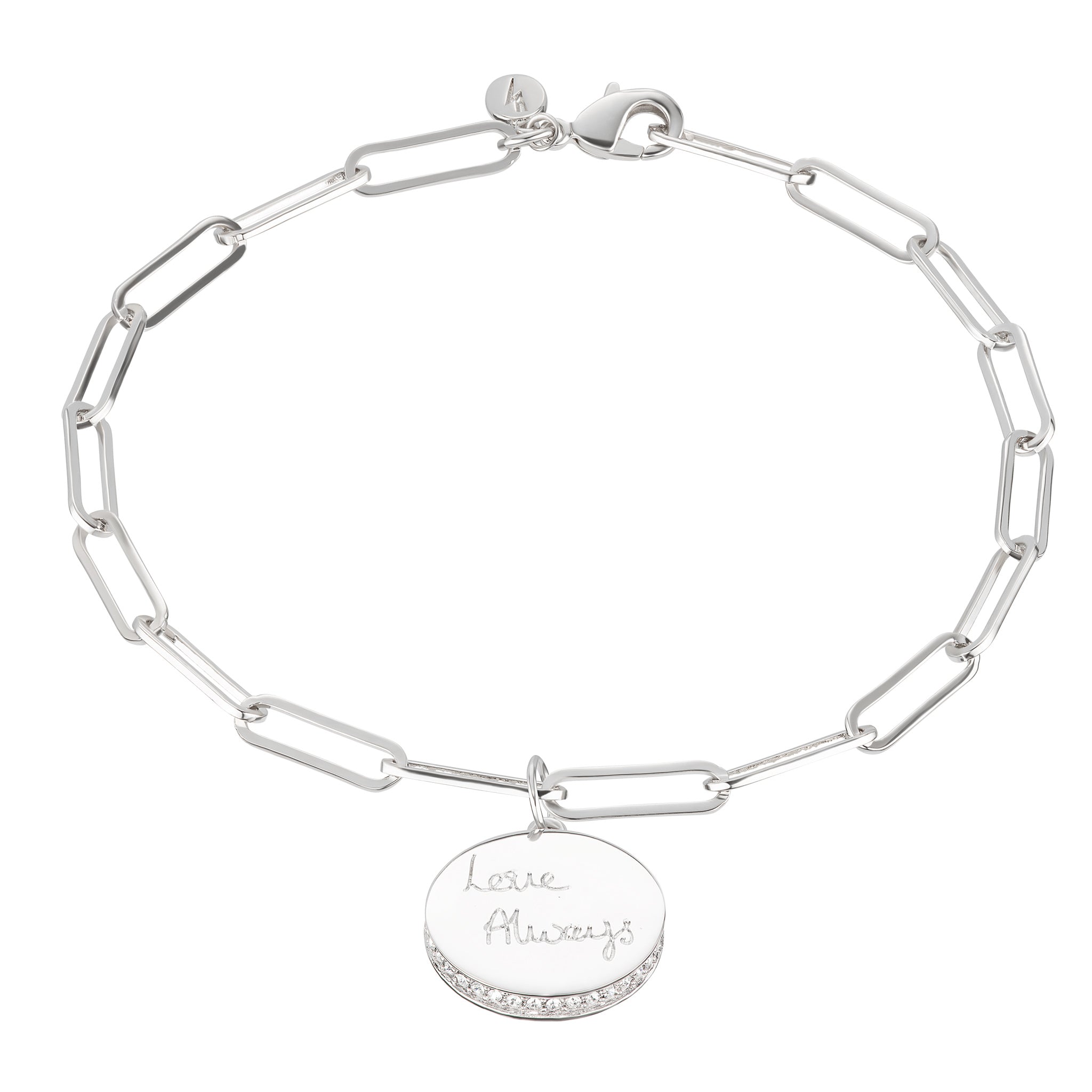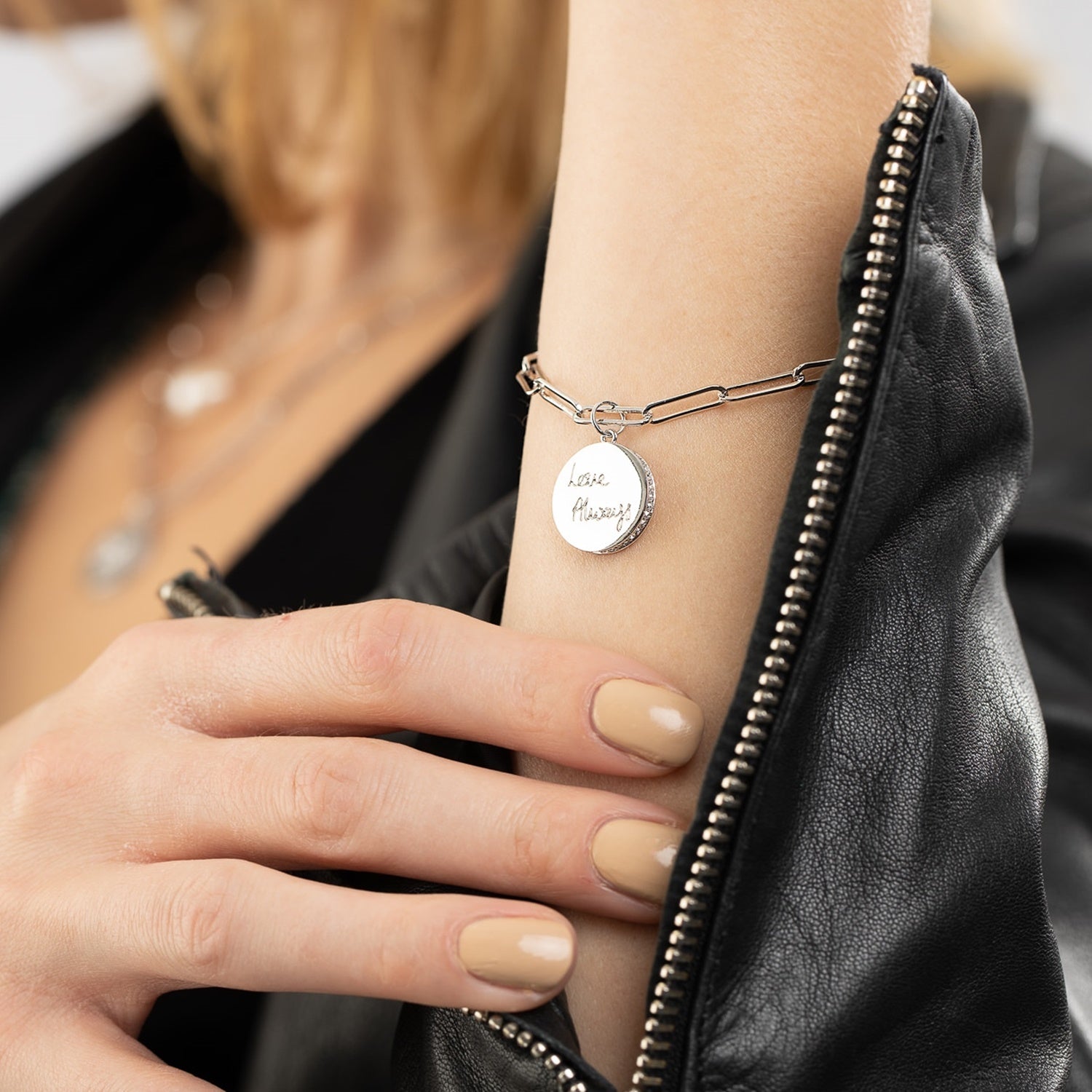 Designed by Hannah Martin this stunning love always bracelet is a design that is close to Hannah's heart. The double sided coin pendant features a 'hugs and kisses' design studded with a dazzling display of clear cubic zirconia stones and a 'love always' in Hannah's handwriting engraved on the back. The stylish long link chain is easy to adjust with the lobster clasp fastening, which can be clipped anywhere along the chain to allow you to find the perfect fit. A stunning design ideal for everyday wear - why not coordinate this bracelet with Hannah's matching Love Always Necklace.