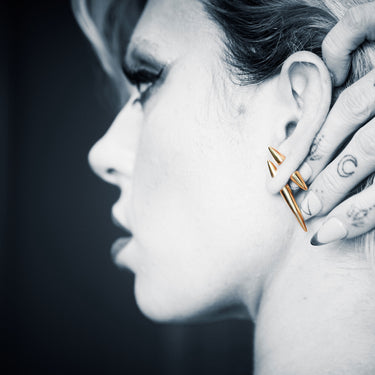 Make a bold statement with our spike double-sided stud earring! Each earring is crafted from sterling silver with the option of 18ct gold plating. Easy to wear this double sided earring is similar to a faux expander that pulls apart to reveal a stud earring post. Simply slot through the ear, align the back and push to close, securely fastened by the notched post.