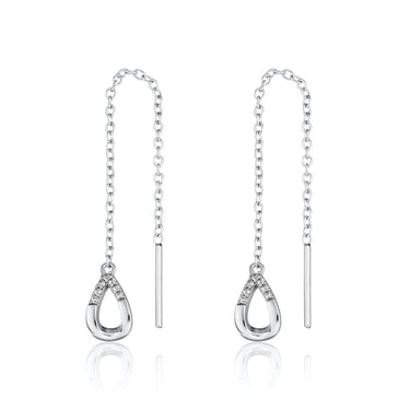 This is threader styling, reimagined. Unlike traditional threader earrings, these illusion threaders feature a fine chain that glides through your ear before curving back into an elegant teardrop hoop, adorned with sparkling cubic zirconia. The fine chain falls freely for fluid movement and delicate drama. The result is a huggie combined threader illusion. Light, dramatic and designed to play with perception, these threader earrings give you stacked style with minimal effort.