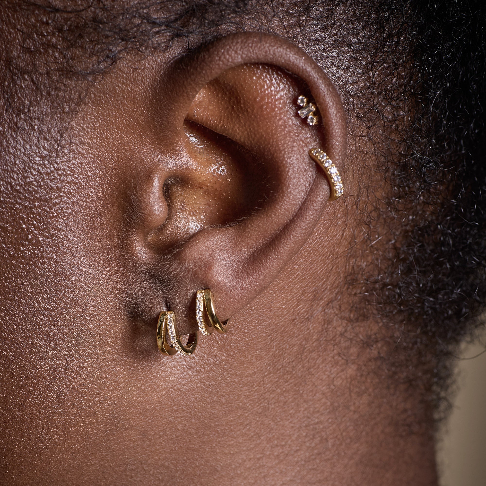 Please be aware that these earrings are a close fit to the ear and may not fit larger lobes or if the piercing is set high. Please see our model image for size reference.